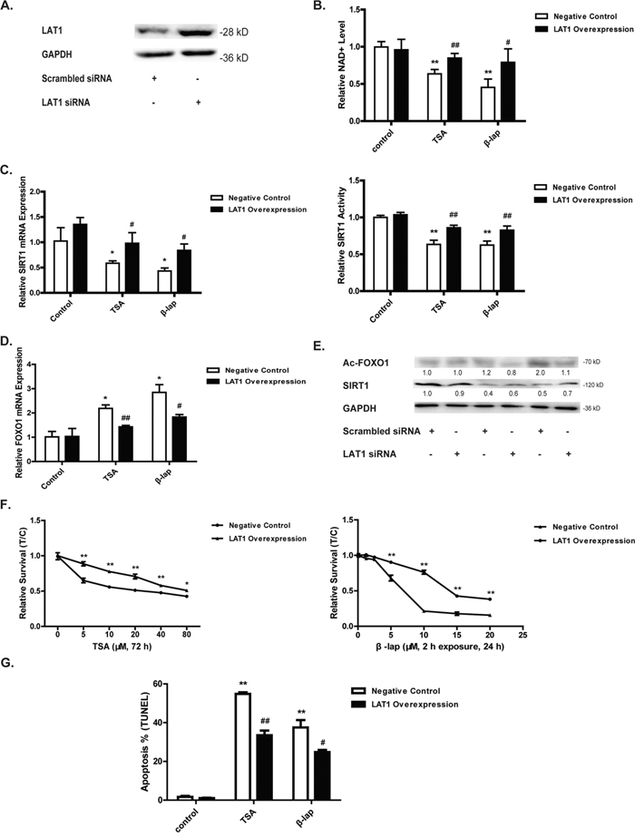 Figure 5: LAT1 overexpression attenuates NQO1 activation induced cell death. Cells were pretreated with LAT1 plasmid for 24 h and the efficacy was evaluated by western blot A. The NAD+ level B. Cells were then treated with TSA (40 μM, 24 h) or β-lap (5 μM, 2 h withdraw, 12 h). The mRNA level and enzyme activity of SIRT1 C. The mRNA level of FOXO1 D. The protein levels of Ac-FOXO1 and SIRT1 E. Cytotoxicity F. and apoptosis test G. were performed after cells treated with TSA (40 μM, 48 h) or β-lap (5 μM, 2 h withdraw, 24 h). Data are shown as mean ± SEM of three independent experiments (*P<0.05, **P<0.01, TSA or β-lap treatment compared with control cells; #P<0.05, ##P<0.01, LAT1 plasmid treatment compared with vector treatment).