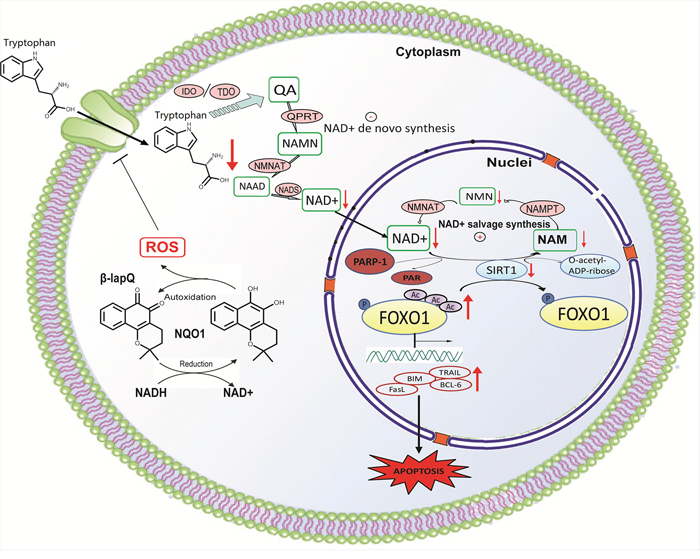 The fine-tuned mechanisms of how FOXOs coordinate with other cellular machineries to selectively upregulate detoxification genes to combat oxidative stress or proapoptotic genes to induce cell death remain largely obscure. FOXO proteins can be acetylated by histone acetyltransferase (HATs) such as p300, the cyclic-AMP responsive element binding (CREB)-binding protein (CBP) and CBP-associated factor (P/CAF), while be deacetylated by silent mating type information regulation 2 homolog 1 (SIRT1) and other histone deacetylases (HDACs). It seems that the acetylation modification is important for FOXOs to activate downstream pro-apoptotic signals. For example, overexpression of SIRT1, an NAD+ dependent deacetylase, inhibits both FOXO3a and FOXO1 induced apoptotic cell death while increases their ability in inducing cell cycle arrest and resistance to oxidative stress [13, 14]. Moreover, oxidative stress can also suppress SIRT1 activity by directly decreasing its protein levels, inhibiting its enzymatic activity by reducing the cellular level of NAD+, rendering the protein for proteasomal degradation [15]. NAD+ serves as a critical coenzyme in fuel reduction-oxidation reactions, also as a cosubstrate for enzymes such as the sirtuins and poly (adenosine diphosphate-ribose) polymerases (PARP). Cellular NAD+ concentrations change during aging [16], inflammation [17] and other diseases. De novo synthesis of NAD+ from tryptophan may play an important part in cancer cells resistant to oxidative stress [18] and is increasingly being recognized as an important microenvironmental factor that suppresses antitumor immune responses [19]. Thus, NAD+-SIRT1-FOXOs signaling pathway is proposed playing pivotal roles in sensing cellular redox status under various physiological and pathological settings. Taking together, we hypothesized that NAD+-SIRT1-FOXOs signaling may be an important sensor of NQO1 triggered oxidative stress initiating apoptotic signaling pathways. In this study, we showed that the nuclear translocation of acetylated FOXO1 in response to NQO1 activation-triggered oxidative stress elicits apoptotic cell death. The accumulation of acetylated FOXO1 is attributed to the decreased SIRT1 activity caused by both the transcriptional downregulation and the depletion of NAD+ pool. Furthermore, PARP-1 hyperactivation consumes large amount of NAD+, rendering cells relying on NAD+ de-novo synthesis from tryptophan. However, tryptophan transmembrane transport was blocked due to L-type amino acid transporter 1 (LAT1) inhibition, leading to an irreversible NAD+ depletion and subsequent activation of SIRT1-FOXO1 apoptotic signaling.