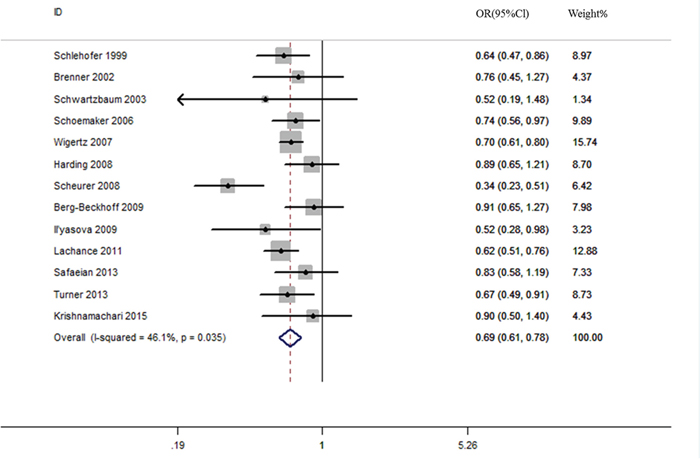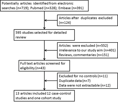 The literature selection process is shown in Figure 1. A total of 719 entries were identified in our search. After an initial assessed of the study titles and abstracts, 43 articles remained for analysis. We excluded 12 studies because the data could not be extracted. Four studies were part of an international analysis [21–24] and included the largest sample sizes [23]. Three case-control studies had partially overlapping subjects [25–27]. In this case, the study with the largest sample size was selected [27]. Finally, 13 studies (12 case-control studies [13, 23, 26–36] and one cohort study [25]) met the eligibility criteria.