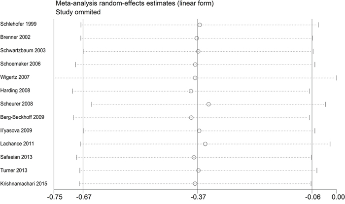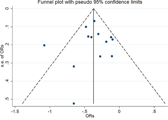 An assessment of heterogeneity suggested that the 13 studies included in the analysis were homogeneous (Chi2 = 22.25, I2 =46.1 %, P = 0.035). Therefore, a fixed-effects model was selected in order to calculate the ORs. In the pooled analysis, individuals with a history of eczema had a decreased risk of incident glioma (OR = 0.69, 95% CI = 0.61–0.78, P < 0.001; Figure 2). In the sensitivity analysis, we removed one single study each time from the overall analysis and evaluated the influence of the omitted data. When any part of the study was omitted, the pooled ORs and 95% CIs did not significantly change (Figure 3). These data indicated that no single study impacted the overall ORs. The shapes of the funnel plots did not show obvious asymmetry (Figure 4). We also performed Egger’s linear regression test and demonstrated that there was no publication bias in the meta-analysis (P = 0.84).