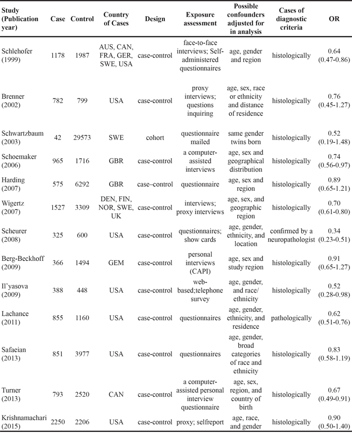 Table 1: Description of the epidemiological studies that assessed the association between eczema and the risk of glioma