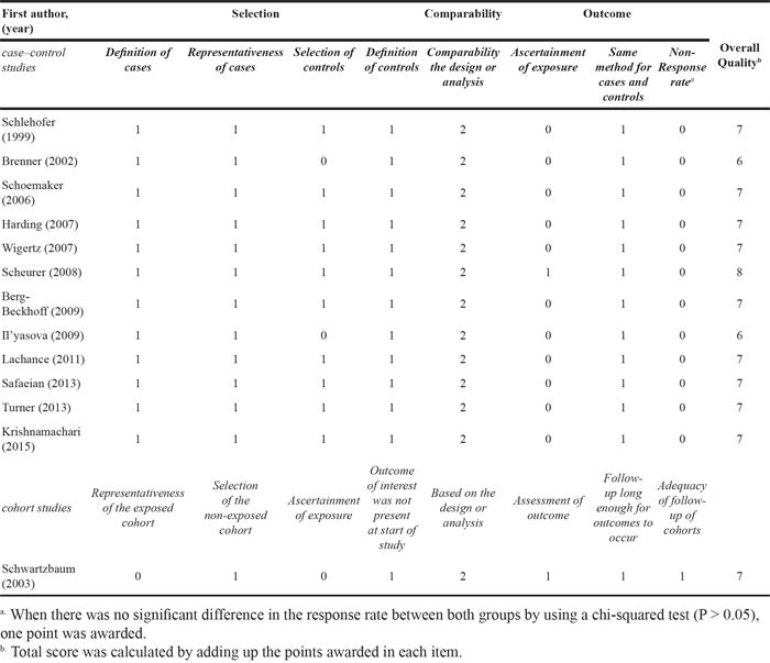Table 2: Assessment of the methodological quality of the case-control and cohort studies based on the Newcastle-Ottawa Scale