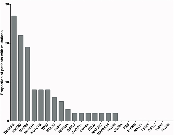Figure 2 depicts the distribution of the mutated genes in the patient cohort. When considering the three most frequently mutated genes, which were each mutated in at least twelve cases, for a contingency analysis, there was a significant negative association observed between TNFAIP3 and MYD88 (p=0.034; Fisher’ s exact test, two-sided).