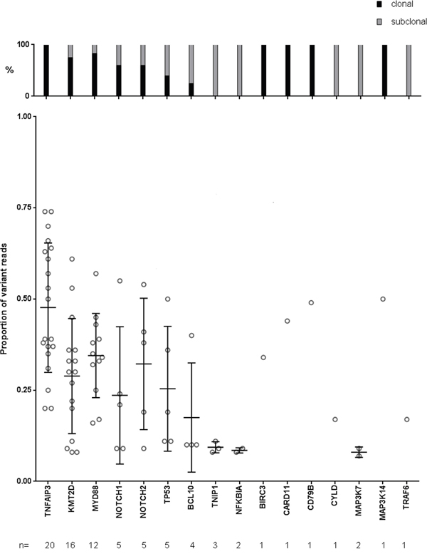 In a targeted sequencing approach with DNA from whole tissue sections, it is often difficult to unequivocally determine whether a mutation is clonal or subclonal in the lymphoma cells. This is mainly due to the difficulty to determine the tumor cell content in the biopsy, the lack of knowledge about aneuploidy of chromosomes with mutations, and potential variation in the efficiency to amplify the wildtype and the mutated allele. In principle, one would expect, for example, in a case with 80% tumor cell content for a clonal heterozygous mutation a variant allele frequency (VAF) of about 40%. The mutations we detected in the OAML (selected to have at least 70% tumor cell content, according to histopathological estimation) showed a wide range of VAF (Figure 4). TNFAIP3 had the highest average VAF of about 48%, indicating that mutations in this gene are mostly clonal. For cases harboring TNFAIP3 mutations with VAF above 50%, it is likely that in these instances either the second allele is deleted in the tumor cells, or that we observe here uniparental disomy of the mutated allele. When setting a cut-off of <20% VAF for mutations that are very likely subclonal, it is evident that a number of genes analyzed harbor mostly if not always subclonal mutations. This includes NOTCH1, TNIP1, MAP3K7, BCL10, and NFKBIA (Figure 4). The fraction of subclonal mutations might well be considerably higher, taking into account the difficulty to quantify the tumor cell fraction based on histopathological evaluation and the technical variation inherent in the experiment.