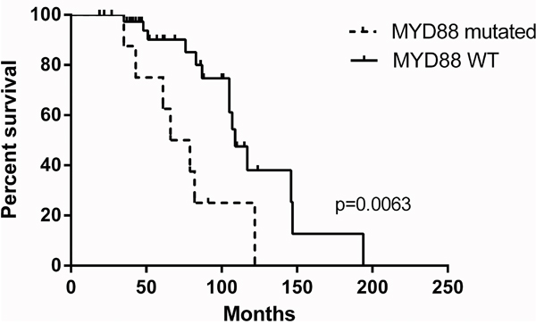 Finally, we aimed to investigate the potential prognostic impact of our findings by comparing the clinical outcome of patient subgroups defined by the presence or absence of the most common mutations using DFS as a clinical read out. Importantly, we found that patients harboring a MYD88 mutation in their tumor cell clone exhibited a significantly shorter DFS as compared to individuals without this genetic abnormality. This finding is reminiscent of two previous studies showing that activating MYD88 mutations may serve as an adverse prognostic marker in aggressive B cell lymphomas [47, 48]. However, our results regarding the prognostic value of MYD88 in OAML are limited by the relatively small number of patients analysed and the retrospective nature of our study. Thus, these encouraging findings need to be validated in an independent patient cohort and ideally in the context of a prospective trial of homogenously treated patients with OAML.