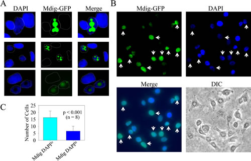 Figure 1: Mdig expression reduces heterochromatin staining. A. Cells expressing mdig-GFP showed reduced DAPI staining; B. A randomly selected field of microscopic image with lower magnification shows the inverse correlation of the GFP signal and the strength of the DAPI signal (arrows); C. Quantification of the cells expressing mdig-GFP with weaker DAPI staining and the cells expressing mdig-GFP with normal or strong DAPI staining; D. Mdig expression diminishes the heterochromatin foci as evidenced by the reduced number of bright DAPI-stained foci and H3K9me3 foci. Note the overlapping pattern of the bright DAPI staining foci and the H3K9me3 foci in the cells without mdig-GFP signal; E. Cells expressing a higher level of endogenous mdig showed reduced DAPI staining (arrows).