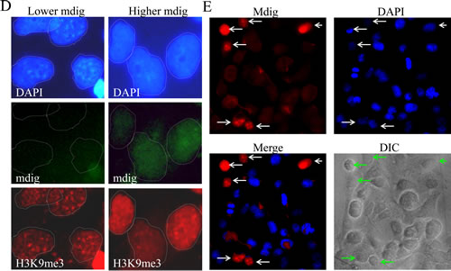 To exclude the possibility that the above observation was a result of the overexpression of the exogenous protein that might have caused an artificial reduction of the DAPI staining signal, we next evaluated the effect of endogenous mdig on DAPI staining. The level of endogenous mdig was measured by staining the cells with an anti-mdig antibody and a secondary antibody conjugated with Alexa Fluor 680 that emits a red fluorescent signal under fluorescent microscopy. A similar inverse correlation of the levels of endogenous mdig and DAPI staining was observed (Fig. 1E, compare the cells indicated by white arrows to the cells without arrow markers). These data clearly indicate that the expression of mdig reduces the overall level of heterochromatin conformation.