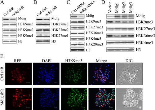 Figure 2: Marginal effect of mdig on total H3K9me3. A & B. Western blotting detection for the mdig protein and the histone H3 methylation status in the cells stably transfected with control shRNA or mdig shRNA. C. Western blotting detection of the mdig protein and the histone H3 methylation status in the cells transfected with a control siRNA or mdig siRNA. D. Western blotting detection of the mdig protein and the histone H3 methylation status in the cells stably expressing a control vector or mdig. E. Immunofluorescent staining of H3K9me3 in the cells stably expressing an RFP-tagged control shRNA or an RFP-tagged mdig shRNA. Nuclei were staining by DAPI.