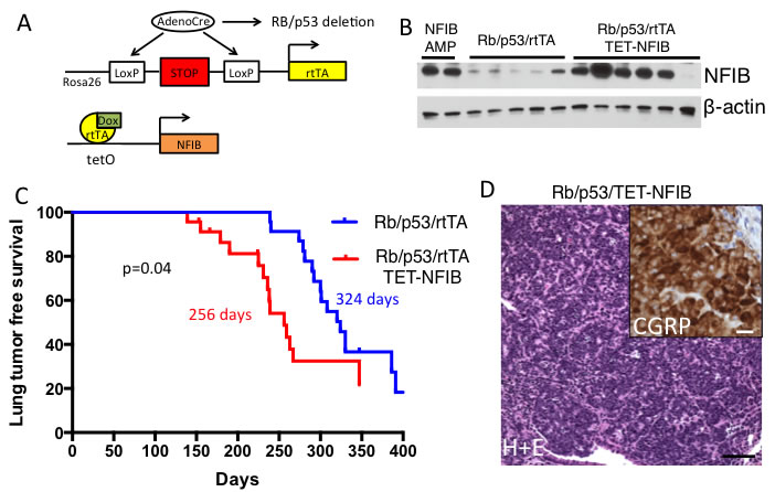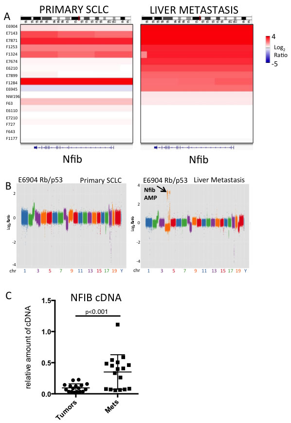 The most metastatic form of lung cancer is small cell lung carcinoma (SCLC). Unfortunately, there is little known about the signaling pathways that control SCLC metastasis. Human metastatic SCLC is rarely resected, hindering our understanding of genetic determinants of SCLC metastasis. We compared genetic differences between primary SCLC and liver metastases from genetically engineered mouse models of SCLC. We identified Nfib as a gene that is frequently amplified in distant liver metastases (Figure 1). Nfib was previously found amplified in SCLC from the Rb/p53 model [10], but in vivo evidence that Nfib functions as an oncogene was needed. Thus, we interrogated Nfib oncogenic function using a sensitized mouse model of SCLC driven by inactivation of Rb and p53, genes inactivated in almost all human SCLCs. Our observation of acceleration of SCLC upon Nfib overexpression (Figure 2) provides definitive evidence that NFIB functions as an SCLC oncogene.