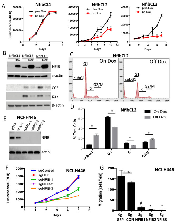 Figure 3: Suppression of NFIB expression reduces cell viability and migration. A. Cell TiterGlo assay showing proliferation in Rb/p53/TET-Nfib cell lines upon removal of doxycycline (DOX). Mean +/- s.d. of triplicate wells shown and data are representative of 3 independent experiments. *p < 0.001, Student’s T-test. B. Western blot showing NFIB, cleaved Caspase 3 (CC3) and p27 protein levels across three Rb/p53/TET-Nfib cell lines in the presence of DOX or 7 days post washout of DOX. Beta actin is used as a loading control. C. FACS analysis for DNA content shows increased subG1 population, indicative of apoptosis, and decreased G1 and S-phase populations upon doxycycline removal in NfibCL2 cell line from Rb/p53/TET-Nfib lung tumor. D. Quantification of FACS data. Data representative of 2 independent experiments, each done in triplicate. *p < 0.001, Student’s T-test. E. Western blot showing NFIB expression in NCI-H446 cell line that underwent lentiviral CRISPR-mediated NFIB deletion. Three NFIB-deleted sub-lines, derived from single cells, are shown along with two control sublines with guide RNAs targeting GFP, or a non-targeting control guide RNA. Two different sgRNA sequences were used, with one clone using sgRNA sequence NFIB#1 and two clones using sgRNA sequence NFIB#2 (see methods). F. CellTiter Glo experiment showing reduced proliferation in the NFIB-deleted H446 cells. G. Transwell migration assay in which NFIB-deleted and control H446 cells were transferred to transwells and allowed to migrate over 17 hours. Crystal violet stained migrated cells were counted. Each cell line was plated in triplicate transwells and results show mean +/- s.d. * p < 0.001, # p < 0.005, Student’s T-test.
