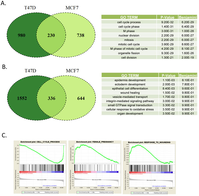 Figure 2: Defining CDK4/6 inhibition signature in ER+/Her2- models A. Venn diagram showing the overlap in genes repressed by greater than 1.5-fold and p < 0.05 in MCF7 and T47D cells treated with PD-0332991 for 120 hours. Top gene ontologies were determined for the genes repressed in both models. B. Venn diagram showing the overlap in genes induced by greater than 1.5-fold and p < 0.05 in MCF7 and T47D cells treated with PD-0332991 for 120 hours. Top gene ontologies were determined for the genes that were induced in both the models. C. Gene set enrichment analysis of selected terms associated with transcriptional repression (e.g. cell cycle) vs. activation (e.g. pregnancy and wound healing).