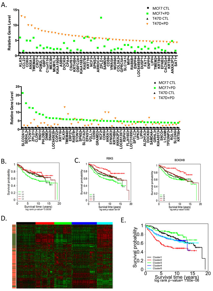 Figure 3: Transcriptional repression by CDK4/6 inhibition and impact on luminal subtypes A. The levels of top repressed genes in T47D cells are presented by rank order. Expression in both T47D and MCF7 cells is shown as denoted by the legend. B. Relative level of genes that make up the OncotypeDX proliferation module were evaluated in MCF7 cells untreated (black bars) and treated with PD-0332991 (gray bars). C. Relative expression of the PAM50 genes untreated and treated with PD-0332991 in MCF7 and T47D cells. Data indicate the consistent suppression of proliferation associated genes that are associated with risk of recurrence. D. Kaplan-Meier analysis of the survival data from 967 ER+/Her2- tumors stratified based on the level of the 230 gene CDK4/6 repression signature. The quartiles associated with transcriptional repression are shown statistical significance was determined by log-rank of the quartiles. The highest expression (Q4) of gene expression is associated with worse prognosis E. Select genes that are significantly repressed by CDK4/6 inhibition in MCF7 and T47D cells and have potent prognostic activity in ER+/HER2- breast cancer are shown. The highest expression (Q4) of gene expression is associated with worse prognosis.