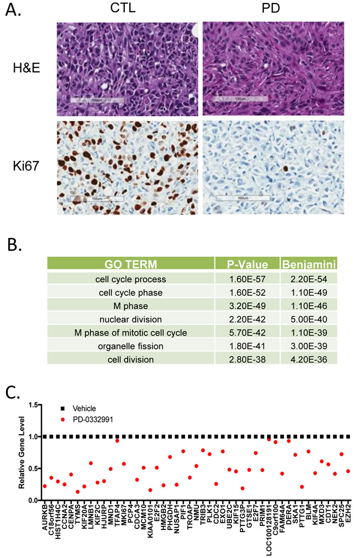 To determine the generality and physiological significance of these repressed genes, we employed an aggressive orthotopic xenograft model. Notably, MDA-MDA-MB-231 cells (derived from triple negative breast cancer) were introduced into the mammary fatpad of NOD/SCID mice. When tumors were palpable (~300 mm3) mice were randomized to treatment with palbociclib (100 mg/kg) daily by oral gavage. After 7 days of treatment, mice were sacrificed and tumor tissue was assessed. As shown in (Figure 4A), there was a pronounced inhibition of Ki67 by treatment with PD-0332991 in vivo. RNA was extracted from the tumors from three independent mice and subjected to microarray analysis. The repressed genes fell into gene ontologies that were veritably identical to the gene expression programs observed from the ER+/HER2- models grown in culture (Figure 4B). At the gene level the overlap in repressed genes was highly significant (p <1x10 -10), consonantly when top repressed genes in T47D cells were evaluated the majority of them were repressed greater than 1.5-fold (Figure 4C). Interestingly, genes that were not repressed in the xenografts (e.g. TFAP4 and DERA) were weakly repressed in MCF7 cells and have roles outside of the cell cycle. Together, these data indicate that there is a highly conserved gene expression program repressed by CDK4/6 inhibitors that transcends breast cancer subtypes.