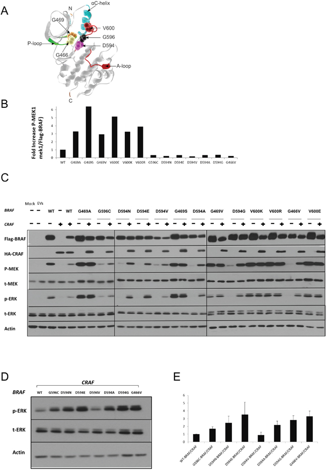 V600 mutated BRAF has constitutively high kinase activity towards its downstream effector, mitogen/extracellular signal-regulated kinase (MEK), which in turn results in strong activation of extracellular-signal-regulated kinase (ERK) [8]. High kinase activity towards MEK due to V600 mutations has also been shown in non-cellular systems [6, 9, 10]. Some non-V600 BRAF mutations confer high kinase activity in cell-free assays, while other non-V600 mutations result in impaired kinase activity. However, kinase-impairing BRAF mutations still induce ERK pathway activation when wild-type CRAF, a hetero-dimerization partner of BRAF, is also present in the cell [9].