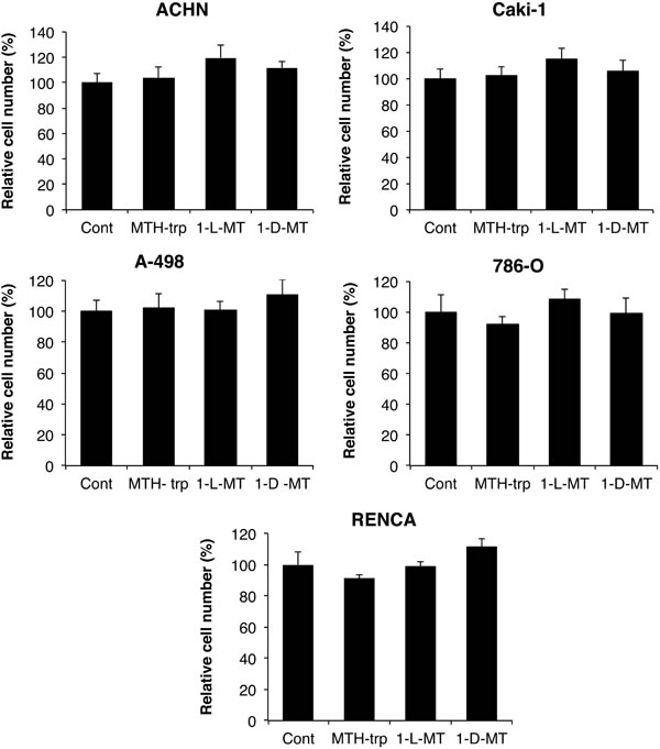 Figure 3: Minimal effect of the IDO inhibitors methyl-thiohydantoin-DL-tryptophan (MTH-trp), 1-methyl-L-tryptophan (1-L-MT) and 1-methyl-D-tryptophan (1-D-MT) on human RCC and RENCA cell growth. Equal numbers of cells were plated in 96-well plates, treated (n = 6 wells/treatment) for three days with different IDO inhibitors or 0.1% DMSO, then final cell numbers measured using the methylene blue assay. Data are representative of three independent experiments.