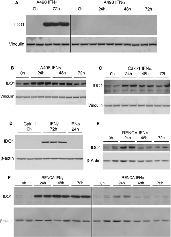 Figure 5: IFNα induces IDO1 in human RCC and RENCA cells. The indicated RCC cells were incubated with IFNα or IFNγ for the times indicated and immunoblotted for IDO1 and vinculin or β-actin. A. A498 cells stimulated with either IFNγ for 72h or IFNα for 24-72h. Chemiluminescent exposure times were the same for all samples. B. A498 cells stimulated with IFNα for 24-72h from A. after a longer exposure. C. Caki-1 cells stimulated with IFNα for 24-72h. D. Caki-1 cells stimulated with either IFNγ for 72h or IFNα for 24h. E. RENCA cells stimulated with IFNα for 24-72h. F. RENCA cells stimulated with IFNγ from Figure 4A and RENCA cells stimulated with IFNα from Figure 5E exposed for the same length of time. Data shown are representative of two independent experiments.