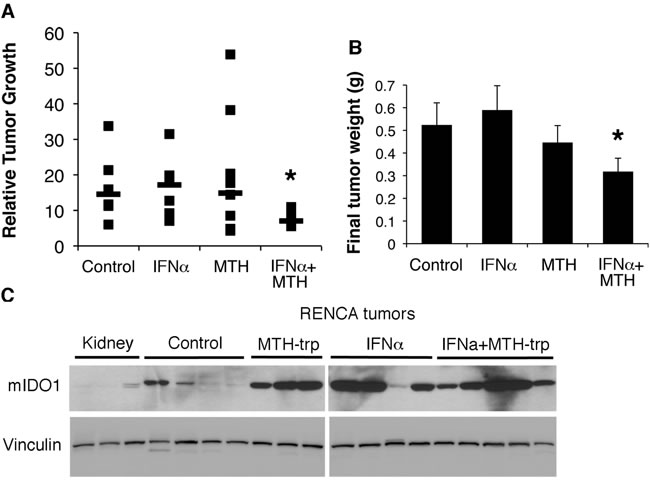 Figure 7: The IDO1 inhibitor MTH-trp enhances the anti-tumor effect of IFNα in vivo. Male Balb/cJ mice (n= 37) were injected subcutaneously with 500,000 RENCA cells on day 0. Treatments were initiated on day 7 and mice were euthanized on day 21; MTH-trp (4 mg/mouse) was injected daily (IP); IFNα (25,000U) was injected 5 d/week (SC). A. Resected tumors were measured with calipers and the relative tumor growth rate for each mouse is plotted as size on day 21/size on day 7. Median data points are indicated with a horizontal line. *P < 0.07 compared to Con (control) and MTH. *P < 0.05 compared to IFNα. B. Final weights of resected RENCA tumors. *P < 0.05 compared to IFNα. *P < 0.1 compared to Con. Data are least squares means ± standard error. C. Proteins extracted from Balb/c mouse kidneys or RENCA tumors from control mice or mice treated with MTH-trp, IFNα or IFNα+MTH-trp were probed for IDO1 expression by immunoblotting.