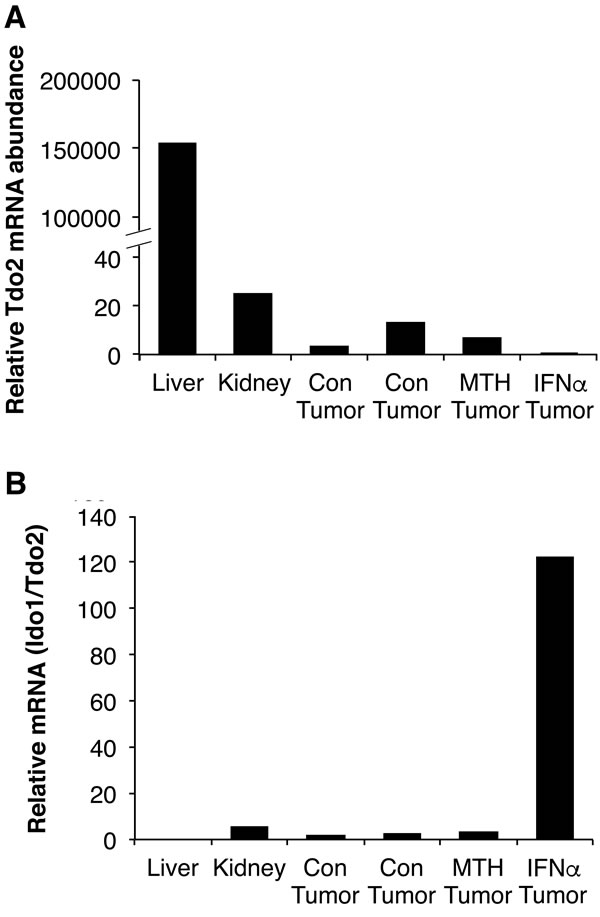 Figure 9: Mouse IDO1 expression levels are much higher than TDO2 in kidney and RENCA tumors. Mouse Tdo2 expression was corrected for Rn18S and Gapdh mRNA levels. Mouse liver (n = 1), mouse kidney (n = 1) and RENCA tumors (n = 4) from control (Con), MTH-trp (MTH) or IFNα treated mice.
