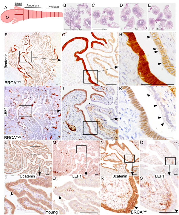 Figure 1: Hyperactive Wnt/βcatenin signalling is present in the Fallopian tube epithelium of BRCA1/2 mutation positive women. Whole fallopian tubes were collected from the BRCA1/2 positive women who underwent risk-reducing salpingo-oophorectomy and were histologically examined for the presence of ovarian cancer precursor lesions using an established protocol described by Moorman et al [46] A. Representative tissue sections of the distal end (fimbriae, B), the middle region (ampulla, C. and D.) and the proximal end (isthmus, E.) are shown in panel B.-E. A typical ovarian cancer precursor lesion presented with nuclear/cytoplasmic (active form) βcatenin F.-H. and LEF1 I.-K. staining. Arrowheads in panel H and K are marking cilia. Representative sections from the fallopian tubes of young or BRCA1/2 mutation negative women showed membranous/cytoplasmic βcatenin L., P., N., R.; arrowhead) and absence of LEF1 staining M., Q., O., S.; arrowhead). Bars: 100um.