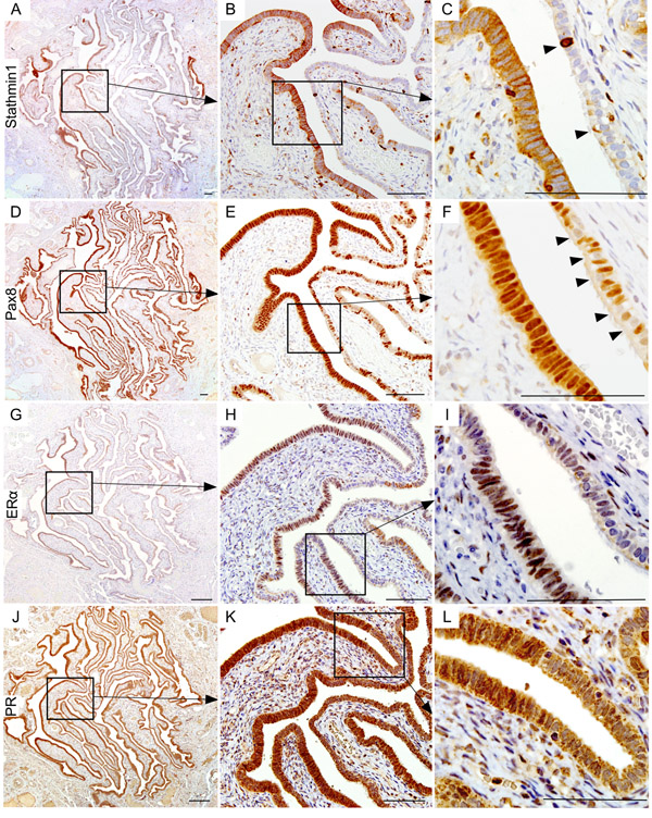 Figure 2: Wnt activation marks the human ovarian cancer precursor lesions. Serial tissue sections of the BRCA1/2 mutation positive fallopian tube epithelia with hyperactive Wnt signalling (nuclear βcatenin and LEF expression) also showed Stathmin1 A., B. and C. and Pax8 D., E. and F. expression, which are known markers of ovarian cancer precursor lesions. Arrowheads in panel C show intermittent positive cells for Stathmin1. Arrowheads in panel F are marking Pax8-negative ciliated cells, a typical feature of normal fallopian tube epithelia. These putative ovarian cancer precursor lesions also expressed ovarian hormone receptors, oestrogen receptor α (ERα; G., H. and I.), and progesterone receptor (PR; J., K. and L.). Bars: 100um.