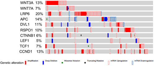 Figure 3: Alterations in the members of Wnt signalling pathway in human ovarian cancer patients. Interrogation of the cancer genome atlas serous ovarian cancer dataset showed significant alterations (113 out of total 182 patients) in the Wnt pathway members.