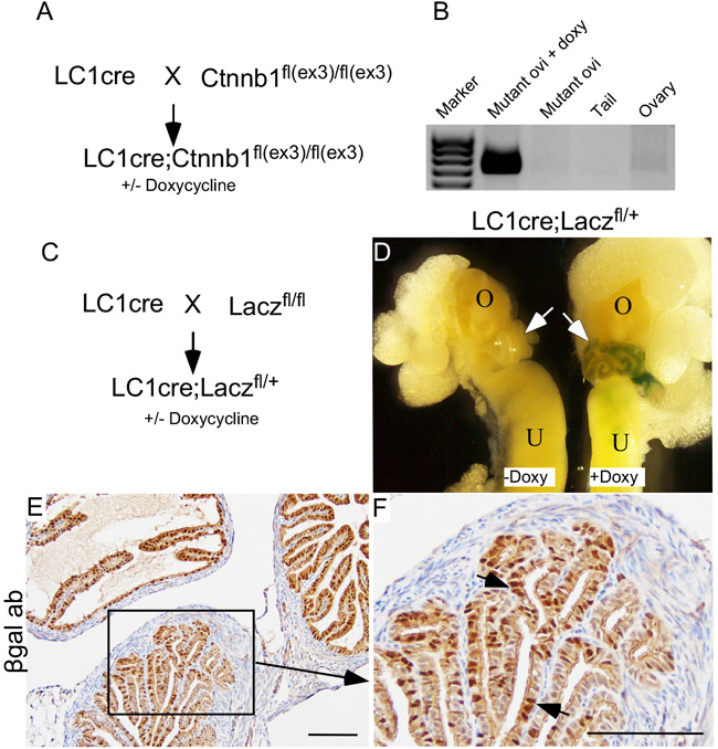 Figure 4: Constitutive activation of Wnt/βcatenin signalling in mouse fallopian tube secretory cells. LC1cre mice were crossed with Ctnnb1fl(ex3)/fl(ex3) to generate LC1 cre;Ctnnb1fl(ex3)/fl(ex3) (βcateninex3cko; A.). Recombination PCR confirmed presence of floxed allele (band size: 0.7kb) in mutant oviduct but not in ovaries B. Mouse tails were used as negative controls B. Breeding strategy used for developing LC1cre driven lacZ reporter mouse model C. The gross image of the female reproductive tract isolated from mice treated with and without doxycycline showed recombination specifically in the fallopian tubes (arrows) of doxycycline treated LC1cre; Laczfl/+ mice, but not in the ovary D. Fallopian tube section from LC1cre; Laczfl/+ mouse stained for βgalactosidase showed secretory cell specific expression (arrows; E. and F.). Bars: 100um.