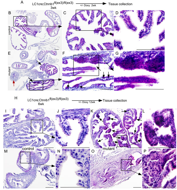 Figure 5: Sustained Wnt/βcatenin signalling in the fallopian tube secretary cells leads to abnormal epithelial growths similar to human SCOUT/STIC. Short-term (2wk) doxycycline treatment of βcateninex3cko mice A. H&E stained Fallopian tube sections from control and short-term doxycycline treated mutant mice B.-G. The mutant fallopian tubes showed epithelial hyperplasia (black arrows) and occluded lumen (red arrow; E.-G. Long-term treatment with doxycycline of mutant mice resulted in wide spread epithelial dysplasia, focal growths (arrows, K. and L.), and blockage of the fallopian tube lumen (O. and P.). Morphologically normal fallopian tubes from control mice (I., J., M. and N.). Bars: 100um.