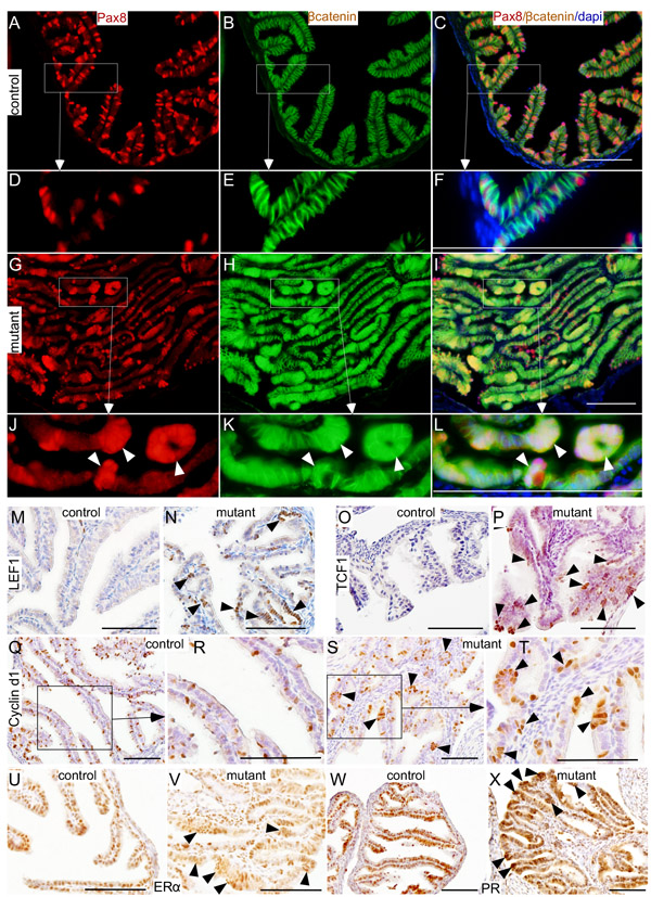 Figure 6: Histopathological analysis of abnormal changes in the mutant fallopian tube epithelium. Pax8 and βcatenin expression in fallopian tubes collected from control mice A.-F. Nuclear/cytoplasmic accumulation of βcatenin in the Pax8-positive epithelial lesions (arrowheads) present in βcateninex3cko fallopian tubes G.-L. Expression of LEF1 (M. and N.), TCF1 (O. and P.), cyclin d1 (Q.-T.), ERα (U. and V.), and PR (W. and X.) in control and mutant fallopian tubes. Arrowheads mark the epithelial lesions that are positive for the probed proteins. Bars: 100um.