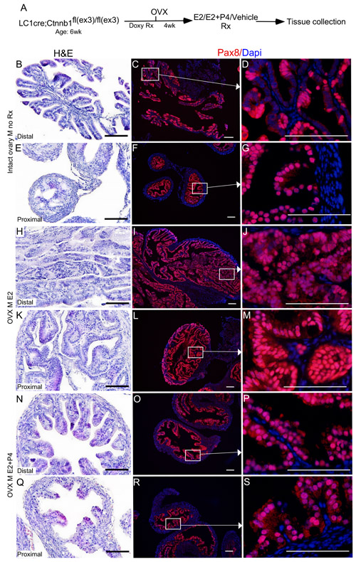 Figure 7: Oestrogen promotes and progesterone suppresses the growth of precancerous lesions in the mutant fallopian tube epithelium. βcateninex3cko mice were ovariectomised to remove endogenous hormones and were subjected to doxycycline and hormonal treatments sequentially, as shown in A. Hyperplasia in the fallopian tube epithelium of mutant mice belonging to the control group B.-D. The Pax8 expression showed focal expansions in the fallopian tube of βcateninex3cko mice C. and D. The cohort subjected to oestrogen treatment developed intraepithelial carcinoma in both the distal H. and proximal K. fallopian tube. Panel I., J., L. and M. shows the secretory cell positive epithelial outgrowths. Mice treated with both oestrogen and progesterone displayed reduced abnormal epithelial growths N.-S. and were comparable to controls B.-G. Bars: 100um.