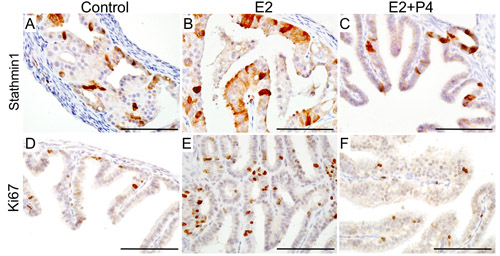 Figure 8: Expression of human ovarian cancer markers in the tumorous lesions observed in the fallopian tube of mutant mice. Expression of Stathmin 1, a well established marker of serous ovarian cancer, in the fallopian tube epithelial growths of control (mutant mice with intact ovaries; A.), oestrogen treated group (E2; B.) and oestrogen plus progesterone treated group (E2+P4; C.). Ki67, a marker of proliferating cells, showed an increase in the rate of proliferation of the fallopian tube epithelial cells in E2 treated group E. compared to control D. and E2+P4 group F. Bars: 100um.