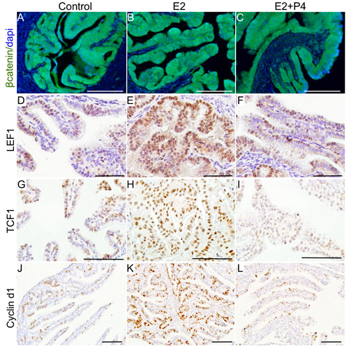 Figure 9: Ovarian hormones modulate Wnt/βcatenin signalling to affect the growth of precancerous lesions. Increased expression of βcatenin and its downstream targets, LEF1, TCF1 and Cyclin d1, in the fallopian tubes of oestrogen (E2; B., E., H. and K.) treated group compared control (mutant mice with intact ovaries; A., D., G. and J.) and oestrogen plus progesterone (E2+P4; C., F., I. and L.) group. Bars: 100um.