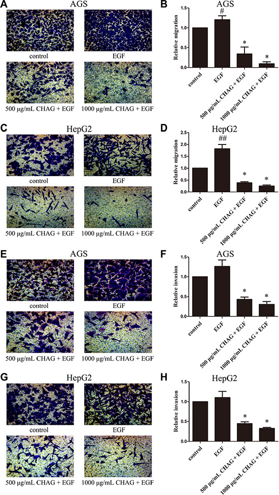 Figure 1: CHAG inhibits migration and invasion activities of gastric and hepatic cancer cells. (A–D) Migration activity of AGS and HepG2 cells. The cells were serum starved overnight, and then divided into Control, EGF, 500 μg/ml CHAG + EGF, and 1000 μg/ml CHAG + EGF groups. In the EGF group, the cells were treated with EGF (100 ng/ml). In the CHAG+ EGF groups, the cells were treated with CHAG (500 μg/ml and 1000 μg/ml respectively) and EGF (100 ng/ml). The migration time was 12 h. (E–H) Invasion activity of AGS and HepG2 cells. Cell treatments were same to migration assay, except the invasion time was 24 h. A, C, E, and G were representative images of migrated or invaded cells stained by Giemsa (×200). B, D, F, and H were the relative migration or invasion activities of the cells in the corresponding groups. The data shown were the means ± SD from 5 independent experiments, each performed in duplicate. (#P < 0.05, ##P < 0.01, compared with control group; *P < 0.01, compared with EGF group).