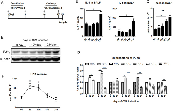 Figure 1: The expressions of P2Ys and UDP release in ovalbumin-induced asthmatic mice. A. The schematic treatment protocol of ovalbumin treatment for building asthmatic mouse model. B. Analysis of released levels of IL-4 and IL-5 in the BALF of ovalbumin-induced asthmatic mice using ELISA method (n = 5). C. Quantification of total cell invasion in the BALF of ovalbumin-induced asthmatic mice (n = 5). D. Real-time PCR was used to detect the expression of P2Ys at the mRNA level in ovalbumin-induced asthmatic mice. The relative mRNA levels of different P2Ys receptors were calculated as the method described in “Real-time PCR” of “Materials and Methods”. (n = 6) E. Detection of P2Y6 expression at the protein level in ovalbumin-induced asthmatic mice by western blot. F. UDP release in the ovalbumin-induced asthmatic mouse is checked by fluorescence polarization (n = 4). * P < 0.05, ** 0.01 < P < 0.05, *** P < 0.01. UDP is the abbreviation of uridine 5’-diphosphate; OVA is the abbreviation of ovalbumin.