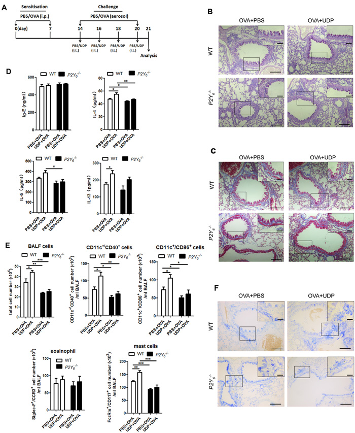 Figure 3: UDP enhance inflammation in ovalbumin-induced asthmatic mice. A. The schematic protocol of UDP treatment in ovalbumin-induced asthmatic mouse model. PAS staining B. and Masson’s trichrome staining C. results for lung tissues in ovalbumin-challenged mice with or without UDP treatment. D. The IgE level in serum and levels of IL-4, IL-5 and IL-13 in the BALF were analyzed using ELISA in ovalbumin-induced asthmatic mice with or without UDP treatment. E. The total numbers of cells in the BALF were quantified for ovalbumin and UDP-treated wild type or P2Y6-/- mice using a blood cell counting plate. Flow cytometry was used to quantify the numbers of dendritic cells, eosinophils, and mast cells in ovalbumin and UDP-treated wild type or P2Y6-/- mice. F. Toluidine blue stains was used to show the mast cell invasion in the lung tissues in mice. Scale bars: 100μm in the panels. * P < 0.05, ** 0.01 < P < 0.05, *** P < 0.01. WT is the abbreviation of wild type; UDP is the abbreviation of uridine 5’-diphosphate; OVA is the abbreviation of ovalbumin.