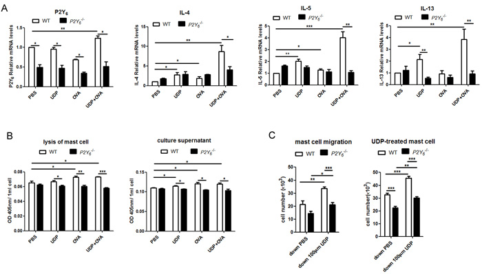 Figure 4: Analysis of the function of P2Y6 activated by UDP on mast cells in vitro. A. Detection of the expression of P2Y6, IL-4, IL-5 and IL-13 in mast cells after stimulation with ovalbumin and UDP by real-time PCR method. B. Mast cell degranulation ability was measured by assessing hexosaminidase activity in the culture supernatant or cell lysates. C. The chemotactic ability of mast cell was determined by the transwell method. * P < 0.05, ** 0.01 < P < 0.05, *** P < 0.01. WT is the abbreviation of wild type; UDP is the abbreviation of uridine 5’-diphosphate; OVA is the abbreviation of ovalbumin.