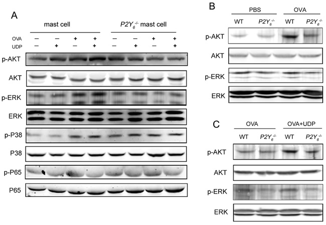 Figure 5: P2Y6-related signaling pathway detection by western blot in mast cells. A. The phosphorylation levels of P65, AKT, ERK, and P38 in mast cells were determined by western blot. B. The phosphorylation levels of AKT and ERK in the lung tissues in ovalbumin-induced wild type and P2Y6-/- mice. C. The phosphorylation levels of AKT and ERK in the lung tissues in UDP-treated wild type and P2Y6-/- asthmatic mice. WT is the abbreviation of wild type; UDP is the abbreviation of uridine 5’-diphosphate; OVA is the abbreviation of ovalbumin.