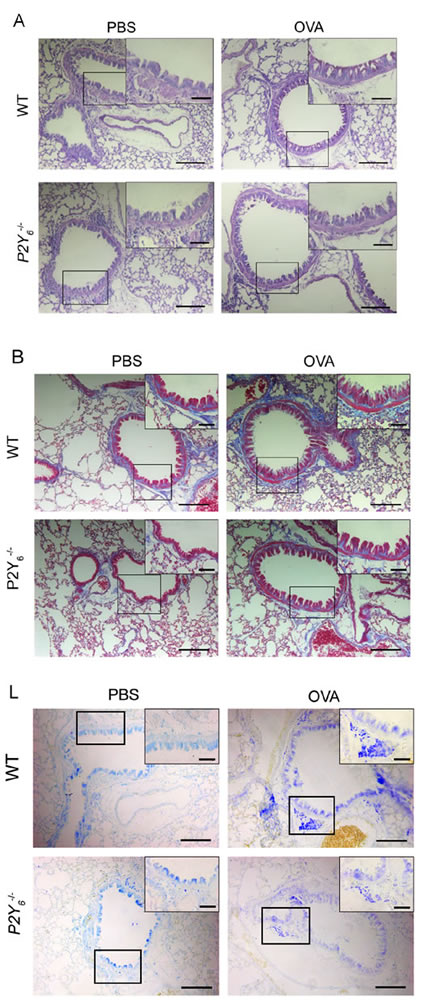 To study the role of P2Y6 in ovalbumin-induced airway conformation and inflammation, we used wild type and P2Y6-/- littermates to build asthmatic mouse models. Firstly, the goblet cell hyperplasia and subepithelial fibrosis in the lungs were observed under a light microscope with PAS and Masson’s trichrome staining in all asthmatic mice. In ovalbumin-induced asthmatic mice, there was a greater increase in hyperplasia of the goblet cells and the deposition of extracellular matrix in the lungs. However, these appearances were all relieved visibly in P2Y6-/- asthmatic mice (Figure 2A, 2B). P2Y6 deficiency relieved the airway conformation and mucus production in the development of asthma in mice.