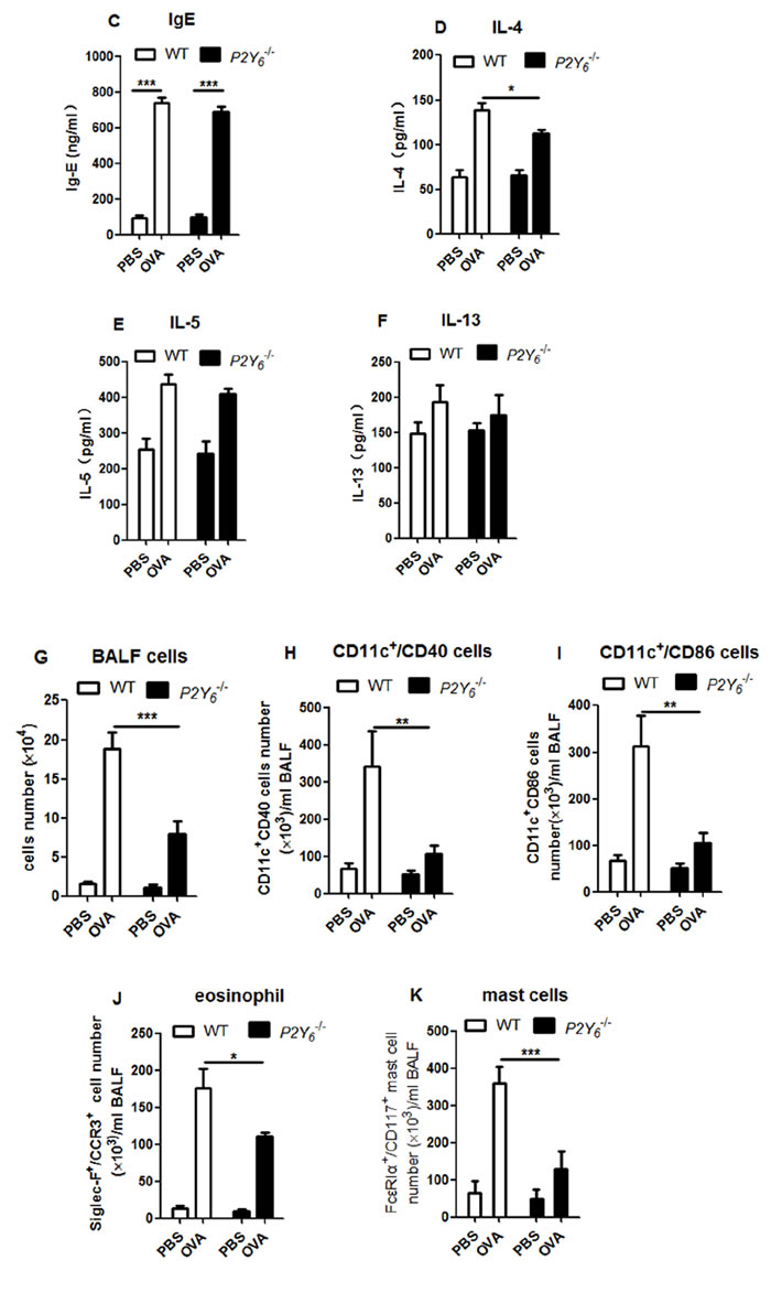 Then we examined whether P2Y6 affected the airway construction through inflammatory reactions. We assessed the levels of IgE in serum and T helper type2 (Th2) relative cytokines IL-4, IL-5 and IL-13 in BALF. Although the level of them were increased in ovalbumin-treated mice, there were no striking difference between the wild type and P2Y6-/- asthmatic mice except IL-4. The level of IL-4 was decreased weakly after P2Y6 knockout in mice (Figure 2C, 2D, 2E, 2F). It indicated that P2Y6 influenced cytokine release slightly in the airway inflammatory reactions in asthma.