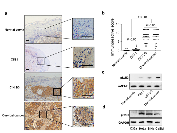 Figure 1: Characteristic Piwil2 expression in cervical cancer and its precursor stages. a. Piwil2 expression detected by IHC in CIN lesion and cervical cancer tissue. Scale bar, 100 μm. b. Immunoreactive score of Piwil2 staining in CIN lesions and cervical cancer tissue. c. Western blot analysis of Piwil2 expression in CIN lesions and cervical cancer tissue. GAPDH expression is presented as a loading control. d. Western blot analysis of Piwil2 expression in cervical cancer cell lines.