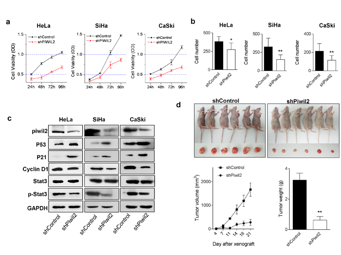 Figure 2: Piwil2 knockdown affects cervical cancer cell line proliferation, invasion, and in vivo tumorigenicity. a. HeLa, SiHa, and CaSki cells were stably transfected with control shRNA or Piwil2 shRNA, and cell viability was measured daily. b. Numbers of invading cells in clones stably transfected with control shRNA and Piwil2 shRNA. c. Equal amounts of lysates from cancer cell lines stably transfected with control shRNA or Piwil2 shRNA were separated by SDS-PAGE, and proteins were analyzed by western blotting with specific antibodies against Piwil2 and molecules regulating cell proliferation. d. Tumor growth over time was measured after the subcutaneous injection of 5×106 of SiHa cells stably transfected with shPiwil2 control shRNA and Piwil2 shRNA. Tumor volume was monitored by caliper measurements twice weekly, and tumor weight was measured after sacrifice at the end of the experiment. The data are presented as the mean±SD. *P < 0.05 and ** P < 0.01 by Student’s t-test.