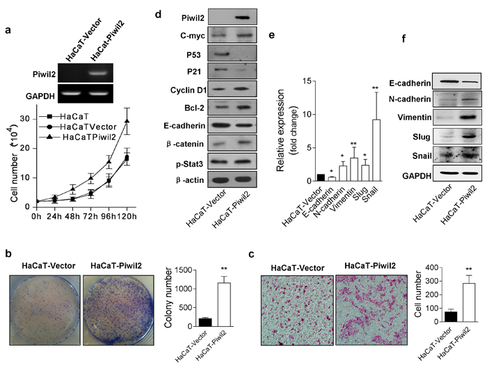 Figure 3: Piwil2 overexpression induces HaCaT cell malignant transformation. a. HaCaT cells were transfected with lentivirus containing Piwil2 or lentiviral vector, and cell numbers were plotted daily. b.-c. Colony formation numbers and invading HaCaT cells infected with lentivirus containing Piwil2 or lentiviral vector. d. Proteins were analyzed by western blotting for c-Myc, E-cadherin, and molecules regulating cell proliferation and apoptosis. e.-f. The expression of EMT markers was determined by qRT-PCR and western blotting in HaCaT cells infected with lentivirus containing Piwil2 or lentiviral vector. The data are presented as the mean±SD. *P < 0.05 and ** P < 0.01 by Student’s t-test.