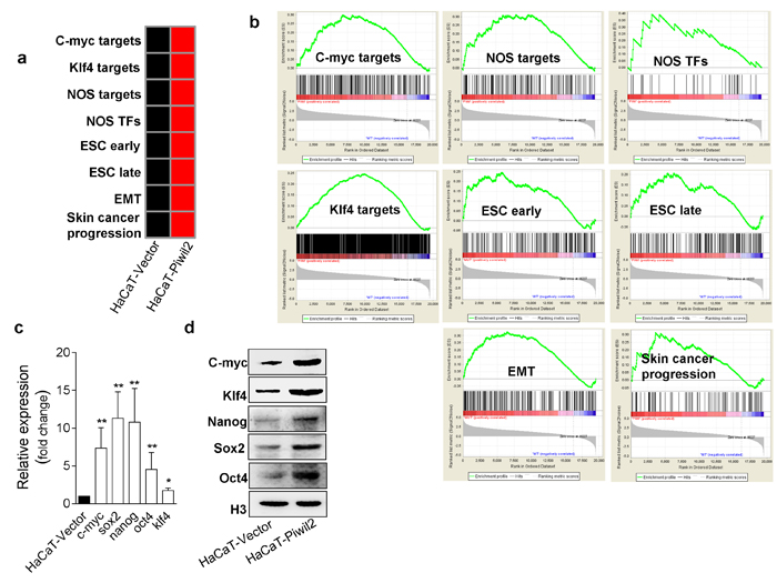 Figure 5: Piwil2 facilitates the establishment of a cancer stem-like cell gene-set enrichment pattern. a. Gene-set enrichment in HaCaT cells transfected with lentivirus containing Piwil2 compared with cells transfected with lentiviral vector. Red, gene-set enrichment; black, no significant enrichment. b. GSEA analyses demonstrating the gene set expression and the relationship between target gene expression and factor occupancy. c.-d. The expression of 5 transcription factors associated with cell reprogramming was determined by qRT-PCR and western blotting in HaCaT cells transfected with lentivirus containing Piwil2 or lentiviral vector. The data are presented as the mean±SD. *P < 0.05 and ** P < 0.01 by Student’s t-test.