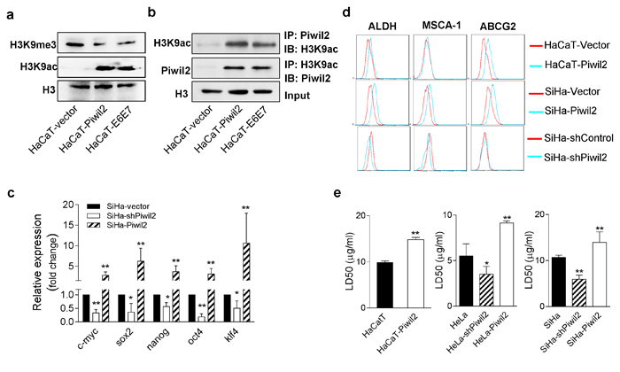 Previous studies have demonstrated that histone modification signatures, especially acetylation and trimethylation of histone 3 lysine 9 (H3K9), are important in controlling gene regulation in ESCs and TICs, in a process called epigenetic programming [20]. H3K9 acetylation (H3K9ac), an epigenetic mark associated with euchromatin, plays an important role in gene activation, thus maintaining “stemness”, by binding to the promoter or transcription start sites (TSS) of NOS, c-Myc, and Klf4 [29]. Conversely, H3K9 trimethylation (H3K9me3), a mark of constitutive heterochromatin, acts as a silencer of transcriptional gene expression, and preventing methylation of H3K9 facilitates the production of induced pluripotent stem cells (iPS) [30]. In this study, we observed that Piwil2 overexpression in HaCaT cells significantly induced H3K9 acetylation but reduced H3K9 trimethylation relative to HaCaT cells transfected only with vector (Figure 7a). Furthermore, the same epigenetic modifications were also observed in HaCaT cells after E6 and E7 stable transfection (Figure 7a). Additionally, the results of co-immunoprecipitation (Co-IP) assays revealed that Piwil2, overexpressed in HaCaT-Piwil2 cells or induced in HaCaT-E6E7 cells, interacted with H3K9ac (Figure 7b). Most importantly, the forced expression of Piwil2 led to a clear upregulation of ALDH, MSCA-1, and ABCG2, three common markers of cancer stem-like cells [16], as detected by FACS (Figure 7d), and a significant LD50 increase of cisplatin, as determined by a CCK8 assay (Figure 7e). Moreover, in cervical cancer cells, Piwil2 overexpression also induced a significant upregulation of c-Myc, Nanog, Oct4, Sox2, and Klf4 (Figure 7c), increased the proportion of cells that were ALDH, MSCA-1, and ABCG2 positive (Figure 7d) and subsequently increased cisplatin resistance (Figure 7e). In contrast, Piwil2 knockdown led to the significant downregulation of c-Myc, Nanog, Oct4, Sox2, and Klf4 (Figure 7c) and slightly decreased the percentage of ALDH-, MSCA-1-, and ABCG2-positive cells, thus rendering cells more sensitive to cisplatin, as compared with cervical cancer cells transfected with the control vectors (Figure 7c, 7d, and 7e).