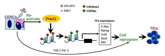 In summary, the current study demonstrates that Piwil2 reactivates multiple germline factors, including c-Myc, Klf4, Sox2, Nanog, and Oct4, through epigenetic programming and subsequently reprograms somatic cells into TICs. Notably, this process may be initiated by oncoproteins E6 and E7 in high-risk HPV, thereby contributing to cervical carcinogenesis. Therefore, targeting Piwil2 may be an effective therapeutic option for patients with cervical cancer and CIN lesions in particular.