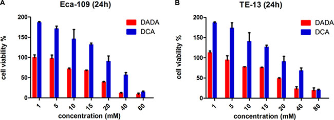 Figure 1: Toxicity of DADA and DCA on human esophageal squamous cell carcinoma cell lines. The ESCC cell lines Eca-109 (A) and TE-13 (B) were seeded in 96-well plates in triplicate and treated with various concentrations of DADA and DCA for 24 h. Cell viability was determined by the CCK8 assay.