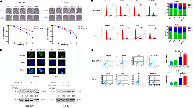 Figure 2: DADA sensitized ESCC cells to radiotherapy in vitro. (A) The survival curves of ESCC. The clonogenic survival assay was used to assess the radiosensitization of DADA on Eca-109 and TE-13 cells. The cells were treated with 10 mM or 8 mM, respectively, and ionizing radiation as illustrated followed by harvesting after incubation for 10–14 d. (B) DADA increased the number of DNA double-strand breaks induced by RT. Eca-109 and TE-13 cells were treated with eitherX-rays alone or in combination with DADA. After incubation for the appropriate time, the cells were fixed for the immunofluorescence detection of γ-H2AX (green). DAPI was used for nuclear staining. Eca-109 and TE-13 cells were treated with either X-rays alone or in combinationwith DADA and subjected to Western blot analysis of the DNA double-strand break-related protein γ-H2AX. (C) Cell cycle distribution after different treatments of ESCC cell lines. Eca-109 and TE-13 cells were treated with DADA, X-rays or the combination treatment and then collected for analysis of cell cycle distribution by flow cytometry. (D) Apoptosis percentage in different treatments of ESCC cell lines. Cells were seeded into 6-well plates at the adequate concentration; incubated with DADA, X-rays or the combination treatment and then harvested after incubation for forty-eight hours. The cells were examined by flow cytometry for apoptosis after staining with annexin-V-FITC/PI. The data are presented as the mean ± SD. * indicated statistical significance versus the control group (p < 0.05).