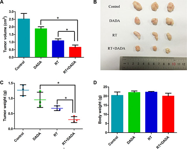 Mice bearing Eca-109 cell xenograft tumors were utilized to determine the radiosensitizing activity of DADA in vivo. As shown in Figure 3A and 3B, both the single DADA and radiotherapy treatments alone reduced the tumor volume growth compared to the control group. Notably, the combination of DADA and radiotherapy produced more tumor volume regression (P < 0.05) versus either radiotherapy or DADA treatment alone. As expected, the tumor weight was smaller in the combination group compared with either single treatment group (Figure 3C). Body weight was not significantly different in each group (Figure 3D). The results demonstrated that DADA could suppress the growth of xenograft tumors in vivo when combined with radiotherapy.