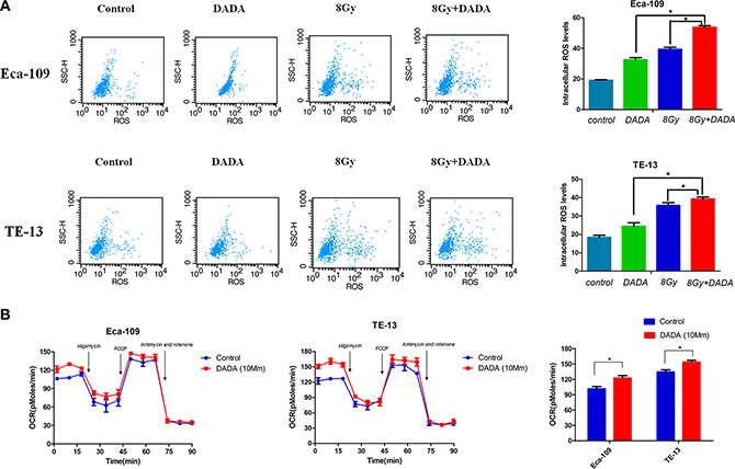 Figure 4: The combination of DADA and radiotherapy increased the oxygen consumption rate (OCR), resulting in increased intracellular levels of ROS in ESCC cell lines. (A) ESCC cell lines were subjected to DADA, X-rays or the combination treatments and harvested for analysis of their ROS levels by flow cytometry. (B) Eca-109 and TE-13 cells were treated with DADA. The bioenergetic profiles of these cells were measured using sequential injection of oligomycin, FCCP, and a mixture of antimycin and rotenone.* indicated statistical significance versus control cells (p < 0.05).