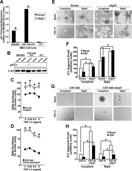 Figure 3: p21 expression is required for morphological normalization and cytostasis driven by CST-Abl. (A and B) Endogenous and genetically manipulated expression of p21 (i.e., shp21) in NMuMG, 4T1, and CST-Abl-expressing 4T1 cells was monitored by semi-quantitative real-time PCR (A), and by immunoblotting (B). Data are the mean (± SE) of 3 independent experiments. *P < 0.05. (C and D) Alterations in DNA synthesis regulated by TGF-β1 (0→5 ng/ml) was determined by [3H]thymidine incorporation assays. Data are the mean (± SE) of 3 independent experiments as indicated. (E and F) 4T1 derivatives employed in Panels C and D were propagated in the absence or presence of TGF-β1 (5 ng/ml) for 7 days in either compliant or rigid 3D-cultures as indicated. Alterations in organoid growth regulated by TGF-β1 (0→5 ng/ml) was determined by Image J analyses. Data are the mean (± SE) of 4 independent experiments as indicated.