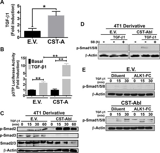 Figure 4: CST-Abl governs the coupling of TGF-β to the activation of Smad2/3 and Smad1/5/8 in 4T1 cells. (A) CST-Abl expression induces the production and secretion of TGF-β1 from 4T1 cells as measured by ELISA assays. Data are the mean (± SE) fold-induction of TGF-β1 in 3 independent experiments. *P < 0.05. (B) Parental (E.V.) and CST-Aβl (CST-A)-expressing 4T1 cells were transiently transfected with p3TP-luciferase and with pCMV-β-gal, and subsequently were stimulated with TGF-β1 (5 ng/ml). Data are the mean (± SE) fold-induction of luciferase activity normalized to that of β-gal in 3 independent experiments. **P < 0.01. (C) Parental (E.V.) and CST-Aβl-expressing 4T1 cells were stimulated with TGF-β1 (5 ng/ml) as indicated in the absence or presence of the TβRI inhibitor, SB431542 (10 μM; Panel D) or the BMP antagonist, ALK1-Fc (200 ng/ml; Panel E). Afterward, the activation status of Smad2, Smad3, and Smad1/5/8 were monitored by immunoblotting as indicated. Differences in protein loading were monitored by reprobing stripped membranes with antibodies against total Smad2/3 and β-actin as indicated. Data are representative images of 4 (C), 2 (D), or 2 (E) independent experiments, respectively.